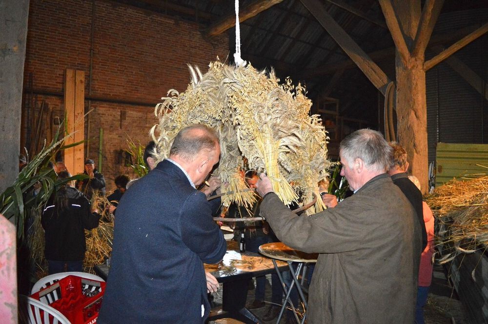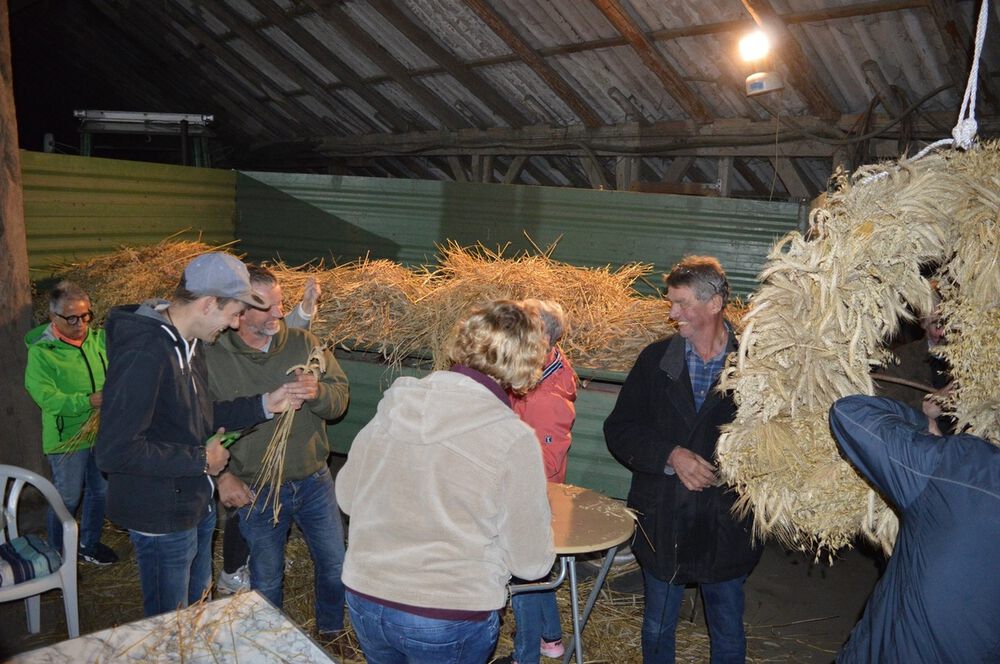 Nach einem leckeren Imbiss ging es emsig in der Scheune von Ilse und Karl-Hermann Gerdes zu. Küstenfrauen und Landvolk Norden banden konzentriert die Getreidegarben zu einer Erntekrone zusammen. Mit vielen Händen und noch mehr Elan war das Werk schnell vollbracht. Die schöne Erntekrone wurde im Rathaus in Norden aufgehängt.