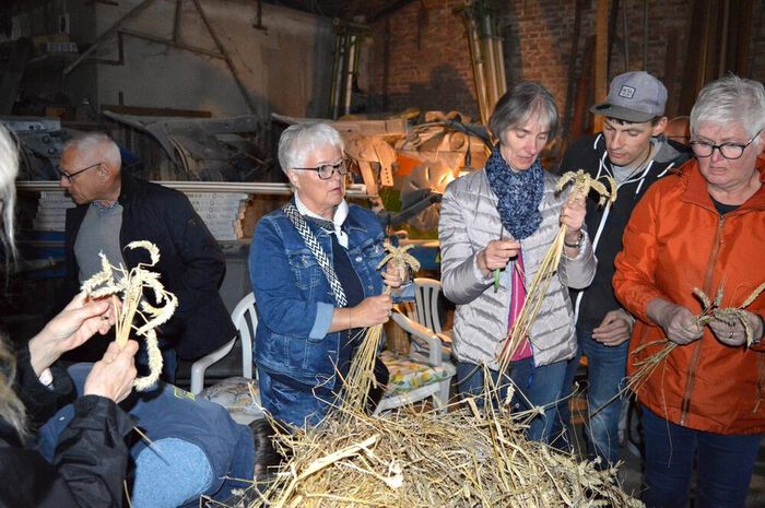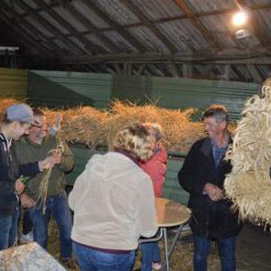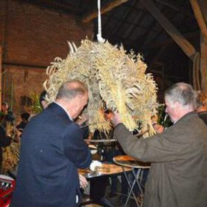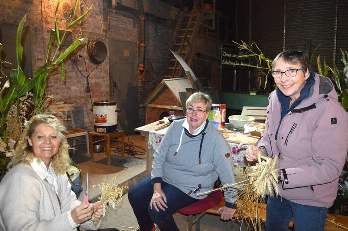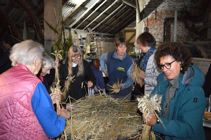Nach einem leckeren Imbiss ging es emsig in der Scheune von Ilse und Karl-Hermann Gerdes zu. Küstenfrauen und Landvolk Norden banden konzentriert die Getreidegarben zu einer Erntekrone zusammen. Mit vielen Händen und noch mehr Elan war das Werk schnell vollbracht. Die schöne Erntekrone wurde im Rathaus in Norden aufgehängt.